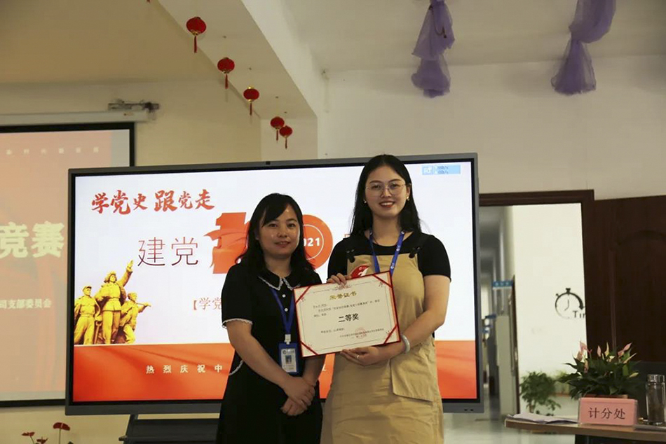 支部书记、总经理梁燕同志致辞。她第一时间祝贺获奖团队和优秀个人,对各位参赛选手沉着应战、赛出风格、赛出水平、赛出成绩、勇夺桂冠表示祝贺,勉励他们再接再厉,继续发扬先锋模范作用。同时,她指出,举办党史知识竞赛目的是引导广大党员回顾中国共产党从创建到开展到壮大的历程,增强对党的归属感和认同感。她希望全体员工要倍加珍惜当前工作、学习、生活环境,要在党史学习教育中学有所成、学有所获,不断提升自己党史理论修养,吸取智慧和力量,增强荣誉感与责任感,在自己的工作岗位上,贡献自己的力量和智慧,以实际行动助推企业高质量开展。